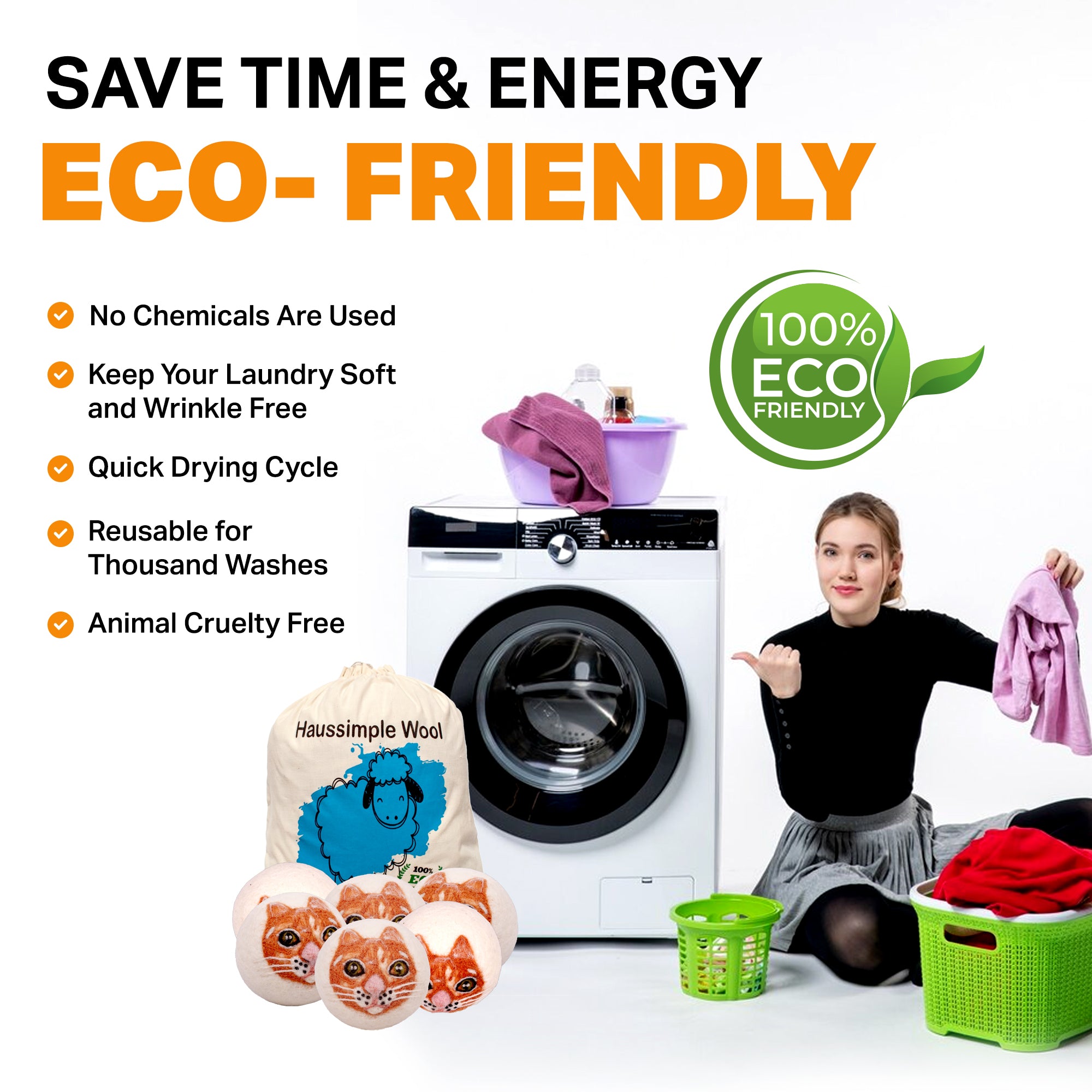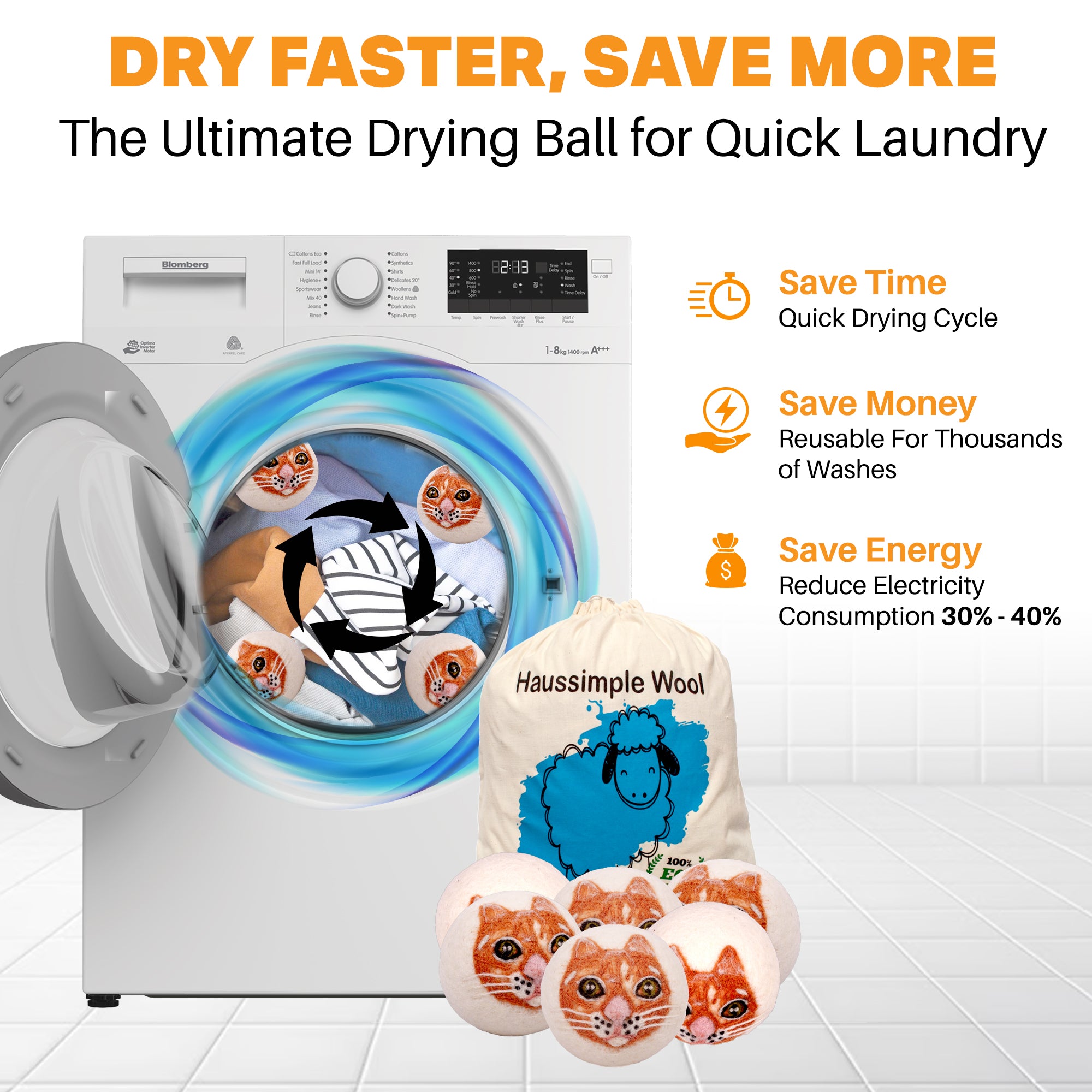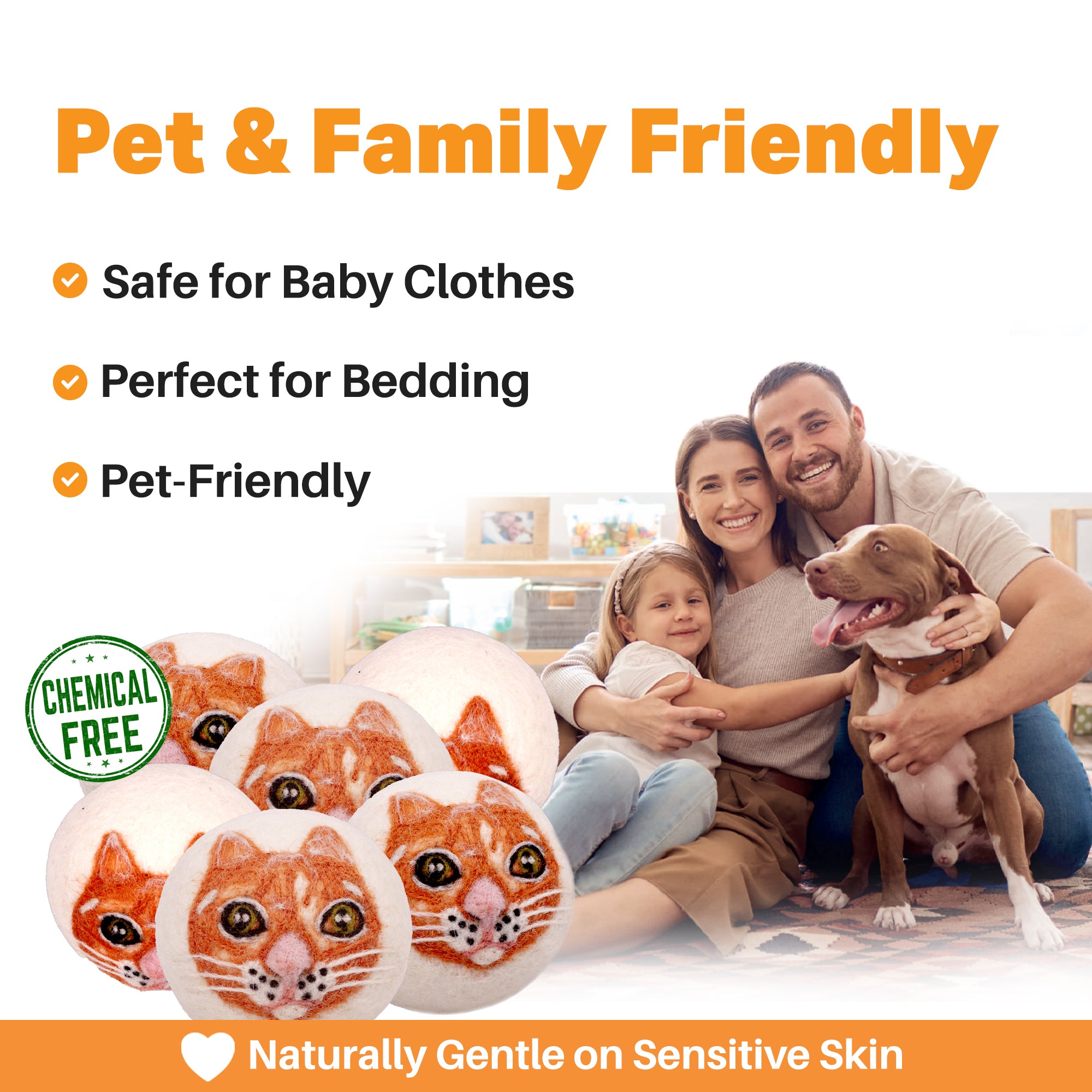6Pcs Extra Large Organic Wool Dryer Balls with Adorable Orange Cat Design, Eco-Friendly Merino Wool, Reusable & Handmade in Nepal